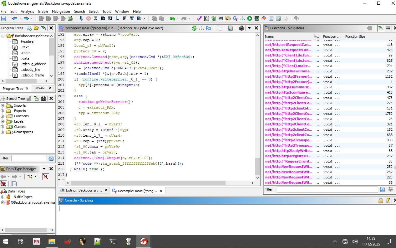 Using Ghidra to decompile the binary, combined with the strings identified earlier, we can locate the main program functions. The main.program.run function appears to contain the core functionality of the malware, including the HTTP GET request to the favicon URL and the setup for the reverse shell connection. The high-level code for this section is as follows: