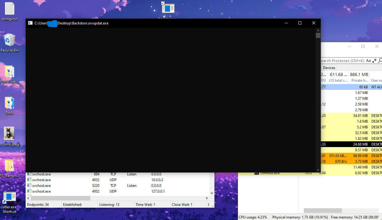 RevShell is a reverse shell malware sample first identified on xyz. It is a GoLang-compiled sample that runs on the x64 Windows Operating System. It consists of an executable, Backdoor.srvupdat.exe, which masquerades as a legitimate server update and sets up a reverse shell on the victim machine. Symptoms of infection include a blank command prompt on the victim machine, an attempt to retrieve a favicon file from an EC2 URL, frequent beacons to a command-and-control server, and continued DNS requests to local domains.