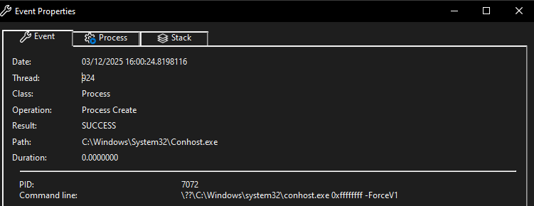 - Command execution: \??\C:\Windows\system32\conhost.exe 0xffffffff -ForceV1