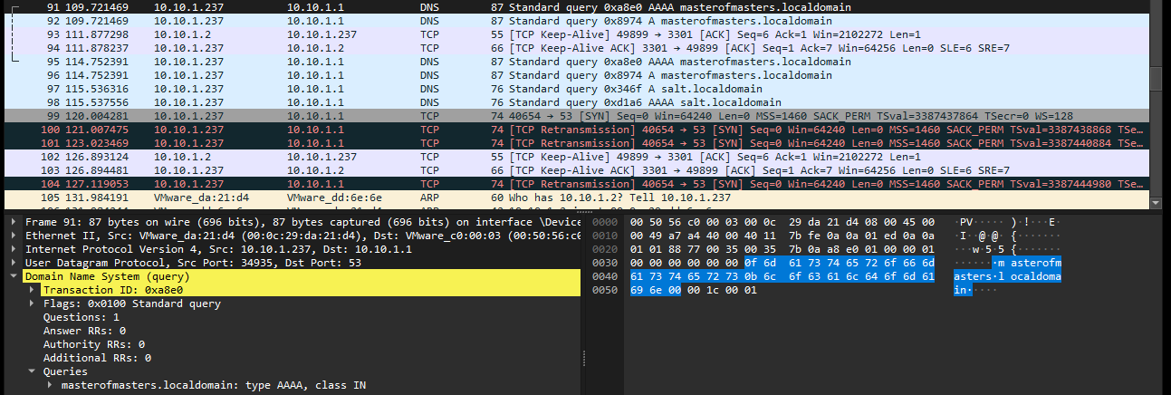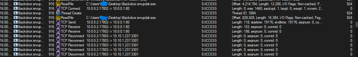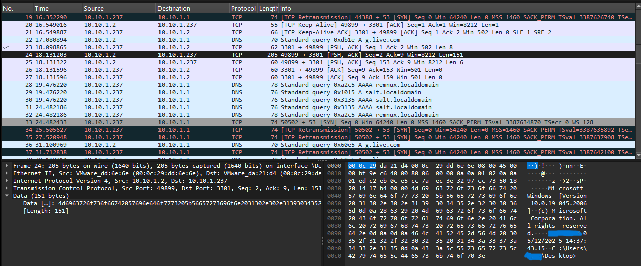 The malware then attempts to establish a reverse shell connection back to 10.10.1.237:3301 over TCP. If the connection is successful, the attacker can execute commands on the victim machine remotely. Regular DNS requests to local domains are also observed, likely as a means of maintaining persistence and communication with the command-and-control infrastructure.