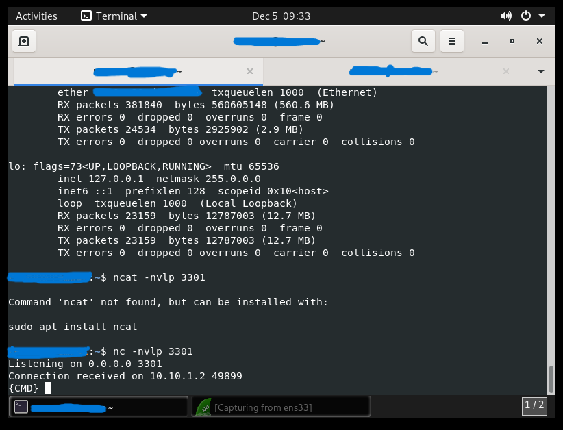 - Reverse shell connection to 10[.]10[.]1[.]237:3301 over TCP